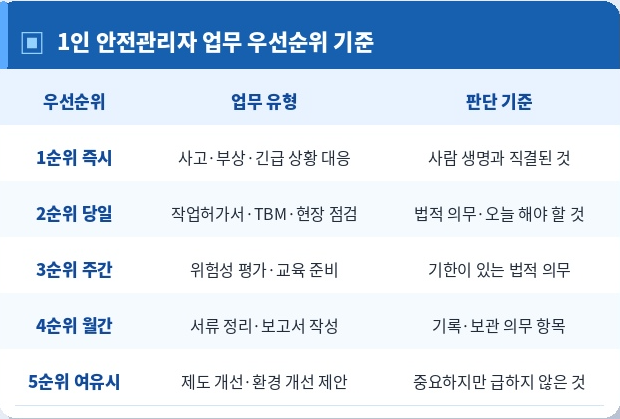 1인 안전관리자가 반드시 갖춰야 할 핵심 역량은 우선순위 판단력이다. 중요도와 긴급도를 기준으로 업무를 분류하고, 한정된 시간 안에 법적 의무와 실질적 안전 확보를 동시에 달성하는 것이 목표다.