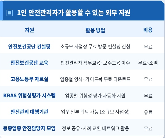 1인 안전관리 체제에서 모든 것을 자체 해결하려는 것은 비효율적이다. 정부와 공공기관에서 제공하는 무료 지원 자원을 적극 활용하면 업무 부담을 실질적으로 줄일 수 있다.