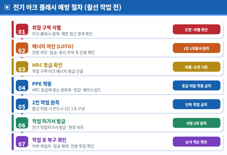 아크 플래시 예방의 핵심은 가능한 한 활선 작업을 하지 않는 것이다. NFPA 70E에서도 "전기 에너지 차단이 가능한 경우 활선 작업을 금지"하는 원칙을 명시하고 있다. 불가피하게 활선 상태에서 작업해야 한다면 아래 절차를 반드시 준수해야 한다.
