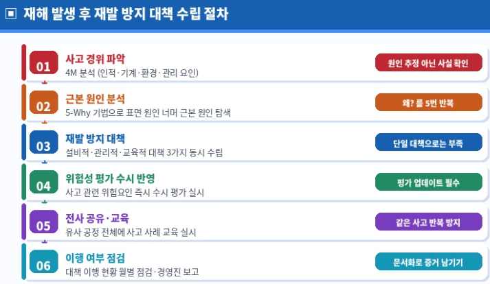 재해 처리가 마무리된 후 가장 중요한 업무가 재발 방지 대책 수립이다. 형식적인 대책이 아니라 근본 원인을 찾아서 실질적인 개선으로 이어지게 해야 한다.