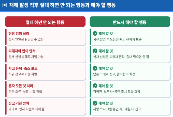 혼자 모든 것을 처리하려는 것도 문제다. 재해 대응은 안전관리자 혼자 감당할 수 있는 범위를 넘는다. 안전보건공단 산업재해예방 콜센터(1644-4544)나 노무사의 도움을 처음부터 요청하는 것이 효율적이다.