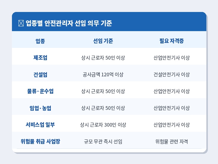 안전보건관리자가 반드시 알아야 할 법정 자격증 총정리 (업종별·규모별 선임 의무 완벽 가이드)