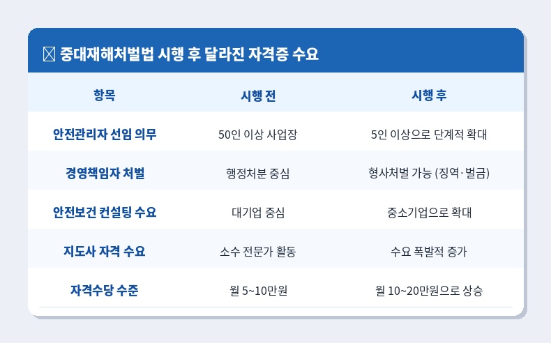 자격수당 측면에서도 변화가 뚜렷하다. 법 시행 이전에는 월 5~10만 원 수준이던 자격수당이 법 시행 이후 기업들의 안전관리 강화 기조와 맞물려 10~20만 원 수준으로 높아진 사례들이 늘고 있다. 안전관리자를 구하지 못해 어려움을 겪는 중소기업이 많아지면서 자격증 보유자의 몸값이 올라가는 추세다.