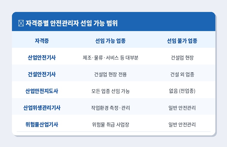 자격증을 취득하더라도 모든 업종에서 안전관리자로 선임될 수 있는 것은 아니다. 자격증마다 선임 가능한 업종의 범위가 법령으로 정해져 있다.