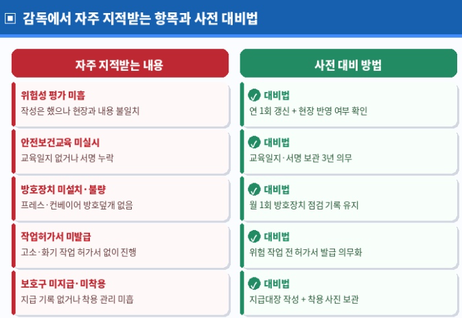 처음 감독을 받을 때는 정말 두려웠다. 지적받으면 어떡하나, 과태료가 나오면 어떡하나 하는 걱정이 앞섰다. 그런데 감독이 끝나고 나서 오히려 감사하다는 생각이 들었다. 내가 놓쳤던 것들을 외부 전문가가 짚어준 것이기 때문이다. 완벽한 사업장은 없다. 감독에서 지적받는 것은 부끄러운 일이 아니라 개선의 기회다. 지적받은 것을 제때 고치고 같은 항목이 다음 감독에서 다시 나오지 않도록 하는 것이 안전관리자로서 해야 할 일이다.