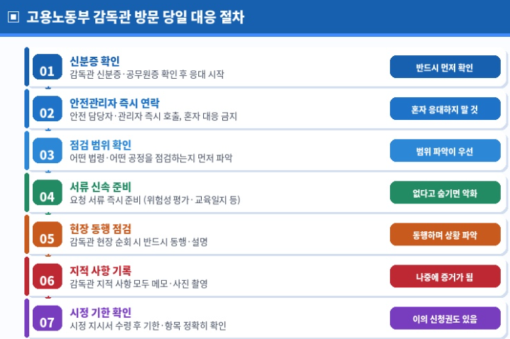 점검 범위를 파악하는 것이 중요하다. 감독관이 어떤 법령 기준으로 무엇을 확인하는지 먼저 물어봐야 한다. 막연하게 "다 보여드릴게요"라고 하면 불필요한 부분까지 노출될 수 있다. 점검 항목을 알면 해당 서류를 먼저 준비할 수 있고 현장 동행 시에도 관련 설명을 미리 준비할 수 있다.